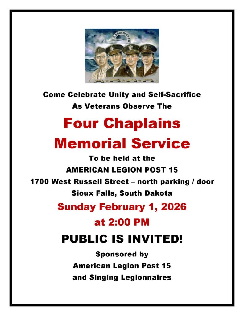 Post News & Updates Special Events Four Chaplains Memorial Service Post15Admin January 15, 2026 About the Author Post15Admin Administrator Visit Website View All Posts Post navigation Previous: Flagpoles For Sale – GREAT Christmas Gift! Related Stories Post News & Updates Special Events Flagpoles For Sale – GREAT Christmas Gift! Post15Admin December 12, 2025 0 Alerts Post News & Updates Special Events Youth Programs A Century of Citizenship Through Sportsmanship: 100 Years of American Legion Baseball Randall Miller May 28, 2025 0 Membership Post News & Updates American Legion’s New Member Welcome Toolkit Available in Digital Dispatch; Randall Miller March 21, 2025 0